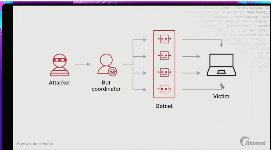 Here is a basic look - Bot Coordinator which is basically some type of C2 instance and then a bunch of compromised assets (IoT devices etc). They start pushing mad amounts of data at the victim. Tracking backwards from the Botnet to who is the attacker is not easy.